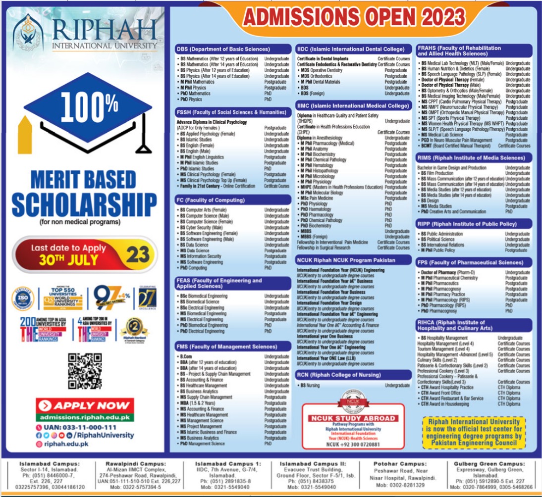 Admissions in Riphah International University 2023 for Diploma, BS, B.Com, MS, D Pharmacy, MS, MPhil has been announced. Eligible students who qualify as per admission criteria in Riphah International University Islamabad Rawalpindi Islamabad Pakistan can apply in Science University for academic year 2023. Eligible candidates for admissions in Pharm D, Master, MS, DPT, Mphil, BBA, B.com, Bachelor, Phd and BS can apply as per Private institute criteria and before closing date 9 August 2023 after reading advertisement online. Read newspaper ad for exact details.