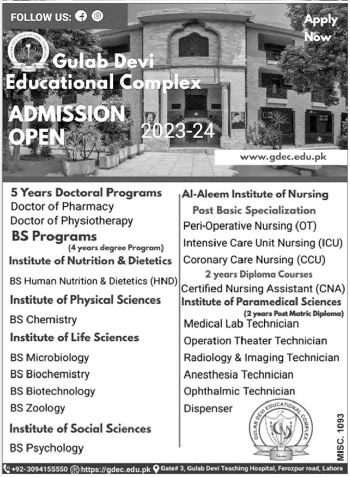 Gulab Devi Educational Complex GDEC has announced admissions 2023 for Diploma, BS, Pharm D, DPT, Post Basic Specialization. Gulab Devi Educational Complex GDEC Lahore Punjab Pakistan welcomes students to apply for admissions in academic year 2023 in Science University. Eligible candidates for admissions in Diploma, DPT, BS, Bachelor and Pharm D can apply as per Private institute criteria and before closing date 13 September 2023 after reading advertisement online. Read newspaper ad for exact details.