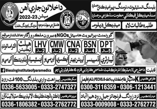 Blessing Institute of Nursing and Paramedics Certified Nursing Assistant CNA, Community Midwifery CMW, Lady Health Visitor LHV, Health Technician, Ultrasound Technician, Laboratory Technician, Dispenser, Operation Theatre Technology, Bachelor of Nursing BSN, Doctor of Physical Therapy DPT admissions 2023 has been announced. Students can enroll for admissions in Blessing Institute of Nursing and Paramedics Karachi Sukkur, Mirpur Khas, and Hyderabad Sindh Pakistan for academic year 2023 to continue campus based or online education in Medical University. Eligible candidates for admissions in DPT, Diploma and BSN can apply as per Private institute criteria and before closing date 3 October 2023 after reading advertisement online. Read newspaper ad for exact details.