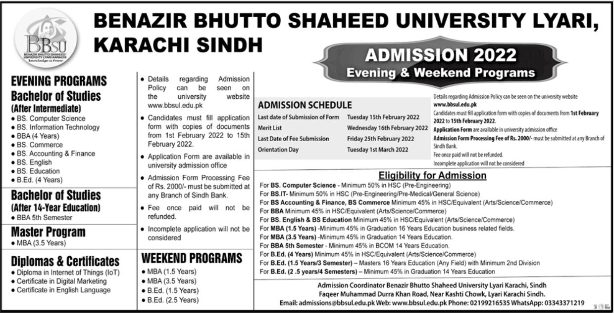 Benazir Bhutto Shaheed University Lyari has announced admissions 2022 for Diploma, Certification, BS, B.Ed, BBA, MBA. Eligible students who qualify as per admission criteria in Benazir Bhutto Shaheed University Lyari Karachi Sindh Pakistan can apply in Science University for academic year 2022. Eligible candidates for admissions in B.ed, Diploma, MBA, Course, BBA and BS can apply as per Government institute criteria and before closing date 15 February 2022 after reading advertisement online. Read newspaper ad for exact details.