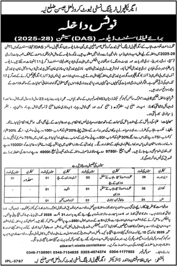 Diploma Courses Admissions 2025 open in Agriculture Training Institute