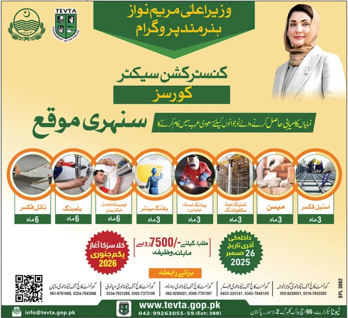 Technical Education & Vocational Training Authority TEVTA Diploma Courses admissions 2025 has been announced. Technical Education & Vocational Training Authority TEVTA Lahore Punjab Pakistan welcomes students to apply for admissions in academic year 2025 in Science College. Eligible students for fulfilling criteria for admissions in can enroll as per Government admission policy 2025 till closing date. Read newspaper ad for exact details.