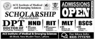Diploma, DPT and BS Program admissions at ACE Institute of Medical