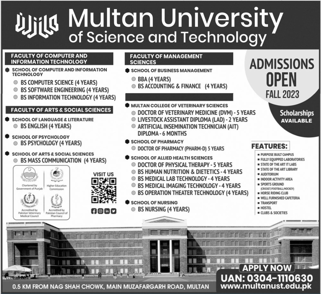 Multan University of Science & Technology Diploma, DVM, BS, BBA admissions 2023 has been announced. Eligible students can apply for academic admissions 2023 in Multan University of Science & Technology Multan Punjab Pakistan for Science University. Students for admissions in DVM, BBA, Diploma and BS & criteria can apply as per Private institute admission policy 2023 before closing date October 24, 2023 as per advertisement. Read newspaper ad for exact details.