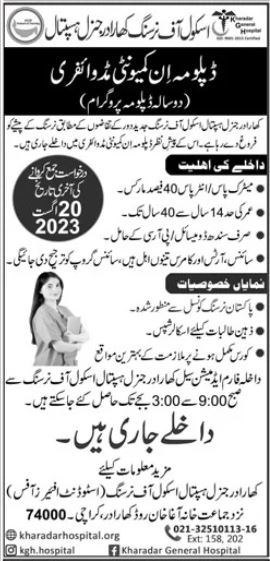 Kharadar General Hospital Diploma in Community Midwifery admissions 2023 has been started. Students who want to take admissions in Kharadar General Hospital Karachi Sindh Pakistan for academic year 2023 to continue education in Medical College can apply. Students for admissions in Diploma & criteria can apply as per Private institute admission policy 2023 before closing date August 16, 2023 as per advertisement. Read newspaper ad for exact details.