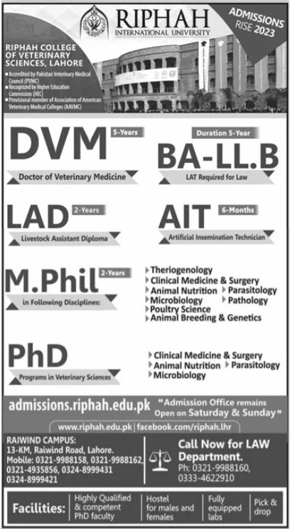 Riphah International University Artificial Insemination Technician AIT, Livestock Assistant Diploma LAD, BA LLB, DVM, MPhil, PhD admissions 2023 has been started. Students who want to take admissions in Riphah International University Lahore Punjab Pakistan for academic year 2023 to continue education in Science University can apply. Students who want to enroll for academic session 2023 in Mphil, Diploma, Course, DVM and Phd qualification and admission criteria for Private institute can apply till last date 13 September 2023. Read newspaper ad for exact details.