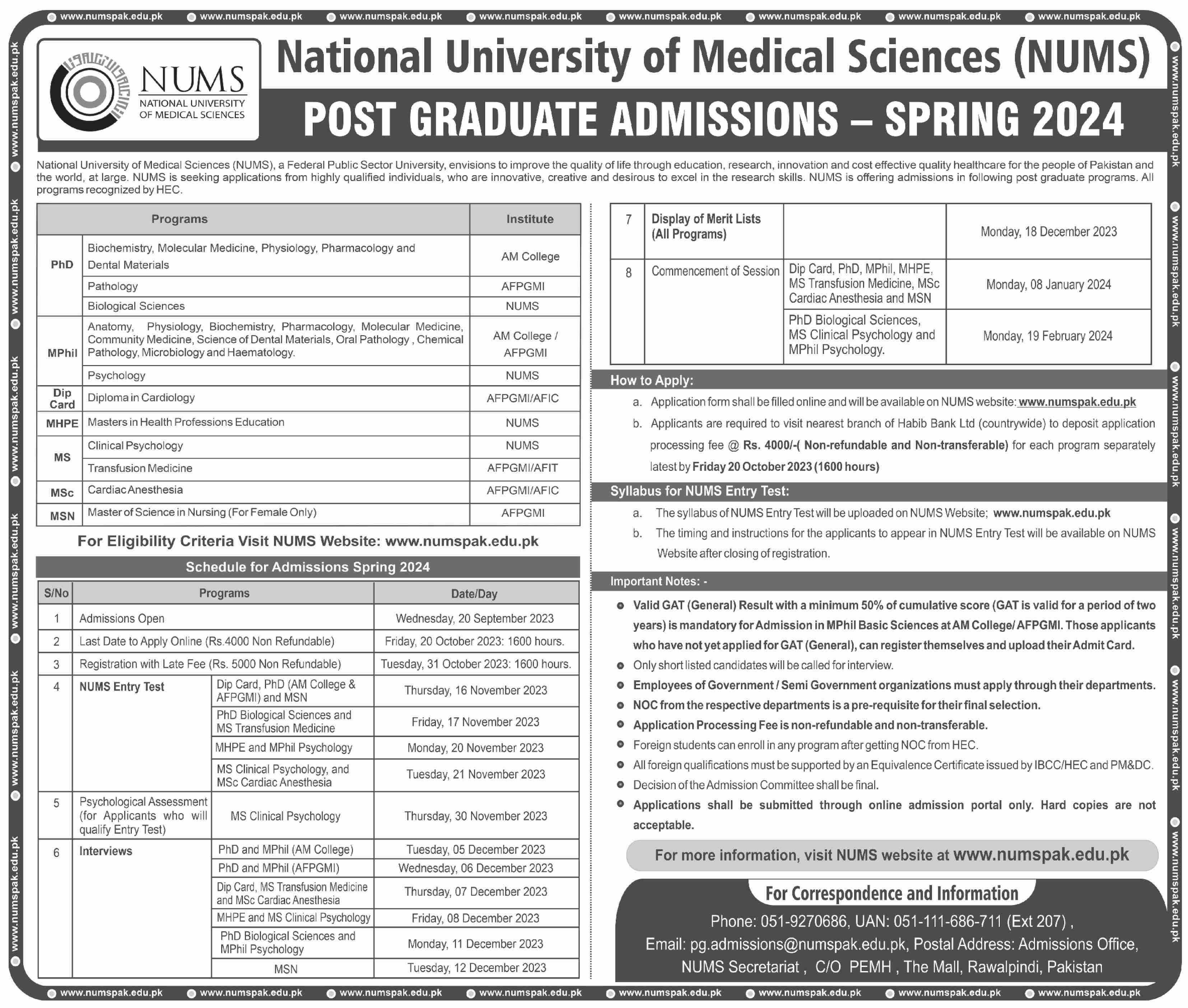 National University of Medical Sciences NUMS Diploma, MS, MSN, MPhil, Phd admissions 2023 has been started. Students who want to take admissions in National University of Medical Sciences NUMS Rawalpindi Punjab Pakistan for academic year 2023 to continue education in Science AIOU can apply. Students who want to enroll for academic session 2023 in Diploma, MSN, Phd, MS, Mphil and M.sc qualification and admission criteria for Government institute can apply till last date 20 October 2023. Read newspaper ad for exact details.