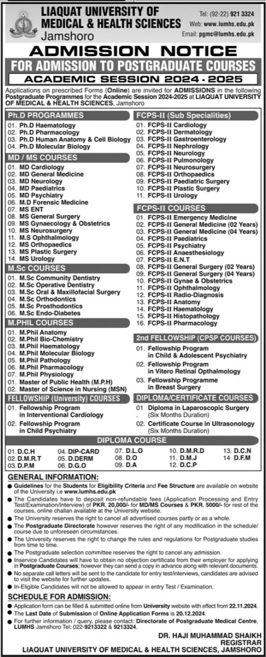 Liaquat University of Medical & Health Sciences Diploma, MSc, MPhil, FCPS II, MS, PhD admissions 2024 has been started. Students who want to take admissions in Liaquat University of Medical & Health Sciences Jamshoro Sindh Pakistan for academic year 2024 to continue education in Science University can apply. Eligible students for fulfilling criteria for admissions in FCPS, Diploma, Phd, MS, M.sc and Mphil can enroll as per Government admission policy 2024 till closing date 20 December 2024. Read newspaper ad for exact details.