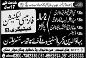 Bahauddin Zakariya Institute fo Health Sciences Multan Pharmacy Technician, Operation Theatre Technology, Medical Lab Technology, Radiology and Imaging Technology, Dispenser admissions 2023 has been announced. Eligible students who qualify as per admission criteria in Bahauddin Zakariya Institute fo Health Sciences Multan Multan Punjab Pakistan can apply in Medical Diploma for academic year 2023. Students who want to enroll for academic session 2023 in Diploma qualification and admission criteria for Private institute can apply till last date 19 December 2023. Read newspaper ad for exact details.