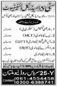 City Paramedical Institute CPI admissions 2024 for Pharmacy Technician, Lab Technology, Operation Theatre Technology, XRay Technology, Dispenser Technology has been announced. Eligible students can apply for academic admissions 2024 in City Paramedical Institute CPI Multan Punjab Pakistan for Medical Diploma. Eligible students for fulfilling criteria for admissions in Diploma can enroll as per Private admission policy 2024 till closing date 11 November 2024. Read newspaper ad for exact details.