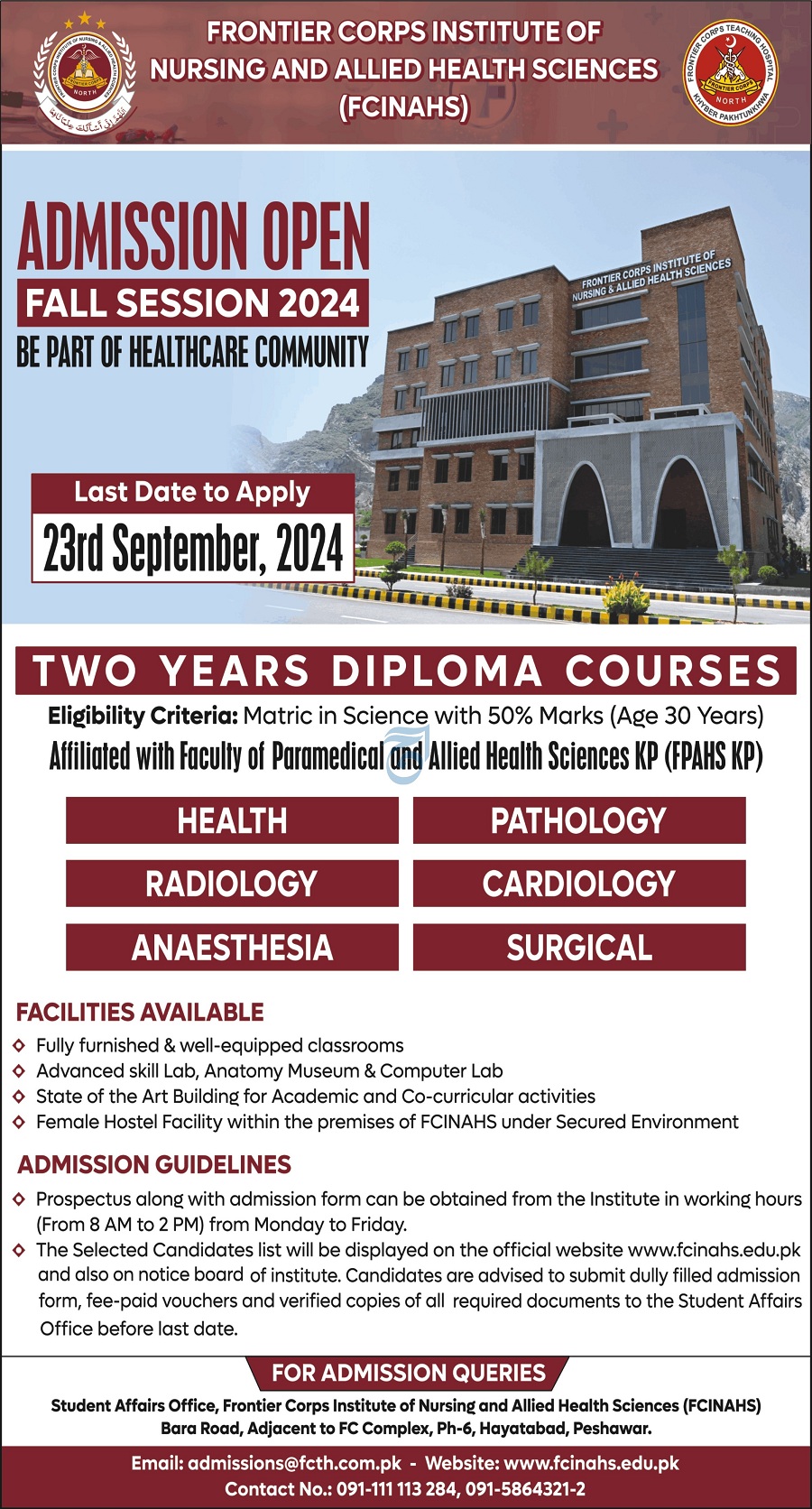 Frontier Corps Institution of Nursing and Allied Health Sciences Diploma Programs admissions 2024 has been announced. Eligible students can apply for academic admissions 2024 in Frontier Corps Institution of Nursing and Allied Health Sciences Peshawar Khyber Pakhtunkhwa KPK Pakistan for Medical University. Eligible students for fulfilling criteria for admissions in Diploma can enroll as per Private admission policy 2024 till closing date 30 September 2024. Read newspaper ad for exact details.