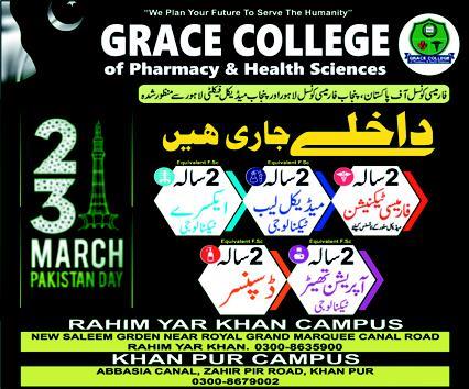 Grace College of Pharmacy & Health Sciences admissions 2024 for Diploma Programs has been announced. Eligible students who qualify as per admission criteria in Grace College of Pharmacy & Health Sciences Rahim Yar Khan Khanpur Punjab Pakistan can apply in Medical Diploma for academic year 2024. Eligible candidates for admissions in Diploma can apply as per Private institute criteria and before closing date 23 April 2024 after reading advertisement online. Read newspaper ad for exact details.