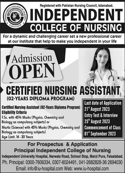 Independent College of Nursing has announced admissions 2023 for Certified Nursing Assistant. Students can enroll for admissions in Independent College of Nursing Faisalabad Punjab Pakistan for academic year 2023 to continue campus based or online education in Medical College. Students for admissions in Diploma & criteria can apply as per Private institute admission policy 2023 before closing date July 21, 2023 as per advertisement. Read newspaper ad for exact details.