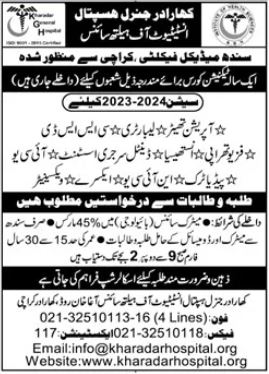 Kharadar General Hospital has announced admissions 2023 for Operation Theatre Technician, Laboratory Technology, CSSD Technology, Physiotherapy Technology, Anesthesia Technology, Dental Surgery Assistant, ICU Technician, Pediatric Technology. Kharadar General Hospital Karachi Sindh Pakistan welcomes students to apply for admissions in academic year 2023 in Medical Diploma. Students for admissions in Diploma can apply for online or campus classes as per Private institute criteria till admission closing date October 10, 2023. Read newspaper ad for exact details.