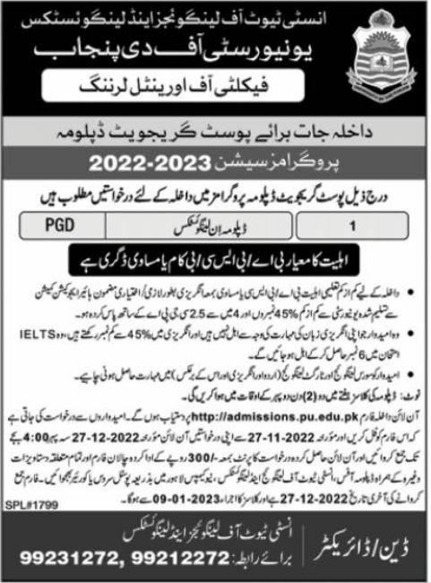 University Of The Punjab PU Diploma in Linguistics admissions 2022 has been announced. University Of The Punjab PU Lahore Punjab Pakistan welcomes students to apply for admissions in academic year 2022 in Language University. Students for admissions in Diploma can apply for online or campus classes as per Government institute criteria till admission closing date December 27, 2022. Read newspaper ad for exact details.