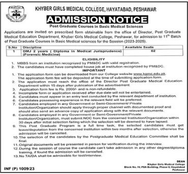 Khyber Girls Medical College has announced admissions 2023 for Diploma Program. Eligible students who qualify as per admission criteria in Khyber Girls Medical College Peshawar Khyber Pakhtunkhwa KPK Pakistan can apply in Medical College for academic year 2023. Eligible candidates for admissions in Diploma can apply as per Government institute criteria and before closing date 26 June 2023 after reading advertisement online. Read newspaper ad for exact details.