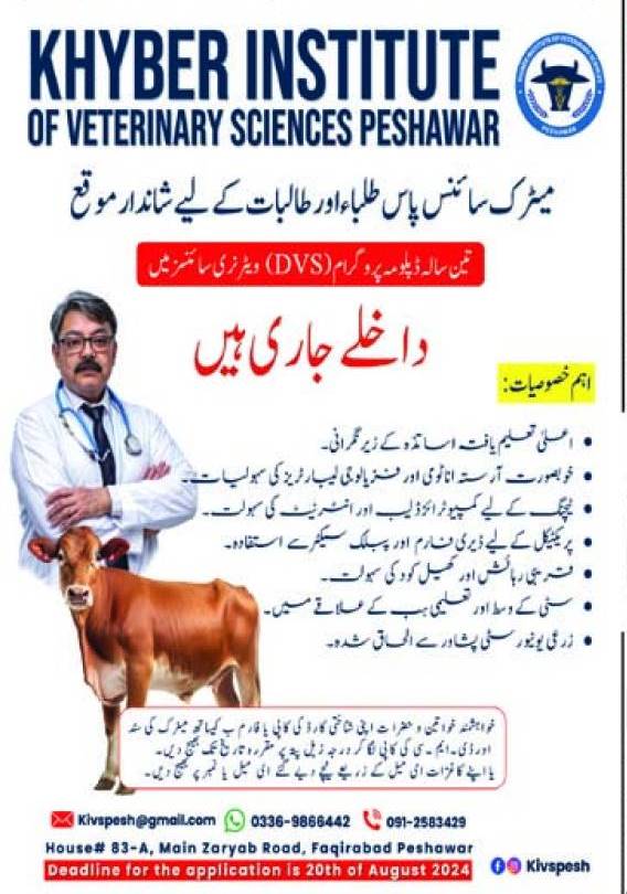 Khyber Institute of Veterinary Sciences admissions 2024 for Diploma in Veterinary Sciences DVS has been announced. Students can enroll for admissions in Khyber Institute of Veterinary Sciences Peshawar Khyber Pakhtunkhwa KPK Pakistan for academic year 2024 to continue campus based or online education in Medical Diploma. Students who want to enroll for academic session 2024 in Diploma qualification and admission criteria for Private institute can apply till last date 12 August 2024. Read newspaper ad for exact details.