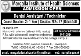 Margalla Institute of Health Sciences Diploma of Dental Assistant, Diploma of Dental Technician admissions 2024 has been announced. Margalla Institute of Health Sciences Rawalpindi Punjab Pakistan welcomes students to apply for admissions in academic year 2024 in Medical Diploma. Students for admissions in Diploma can apply for online or campus classes as per Private institute criteria till admission closing date November 14, 2024. Read newspaper ad for exact details.