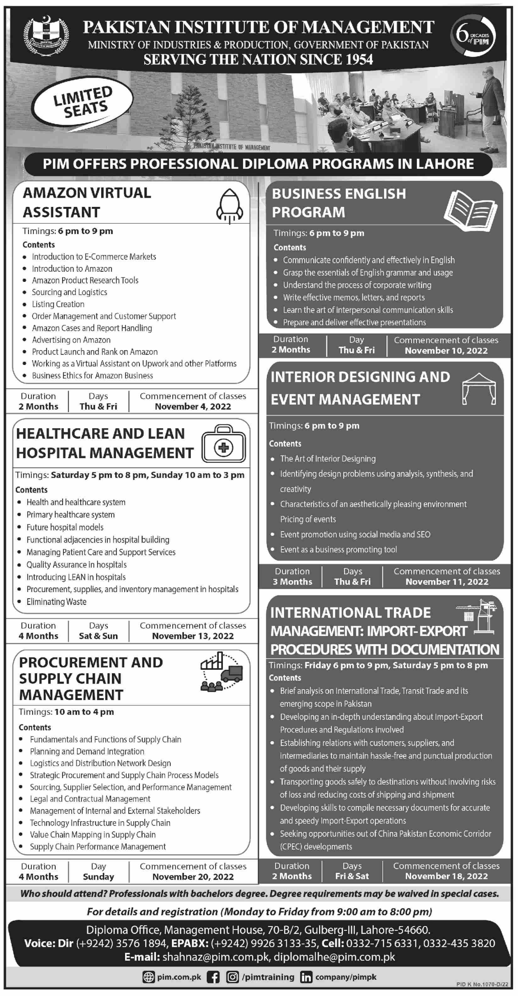 Pakistan Institute of Management Amazon Virtual Assistant, Healthcare and Lean Hospital Management, Procurement and Supply chain Management, Business English Program, Interior Designing and Event Management, International Trade Management admissions 2022 has been started. Students who want to take admissions in Pakistan Institute of Management Lahore Punjab Pakistan for academic year 2022 to continue education in Science College can apply. Students who want to enroll for academic session 2022 in Diploma qualification and admission criteria for Government institute can apply till last date 31 October 2022. Read newspaper ad for exact details.