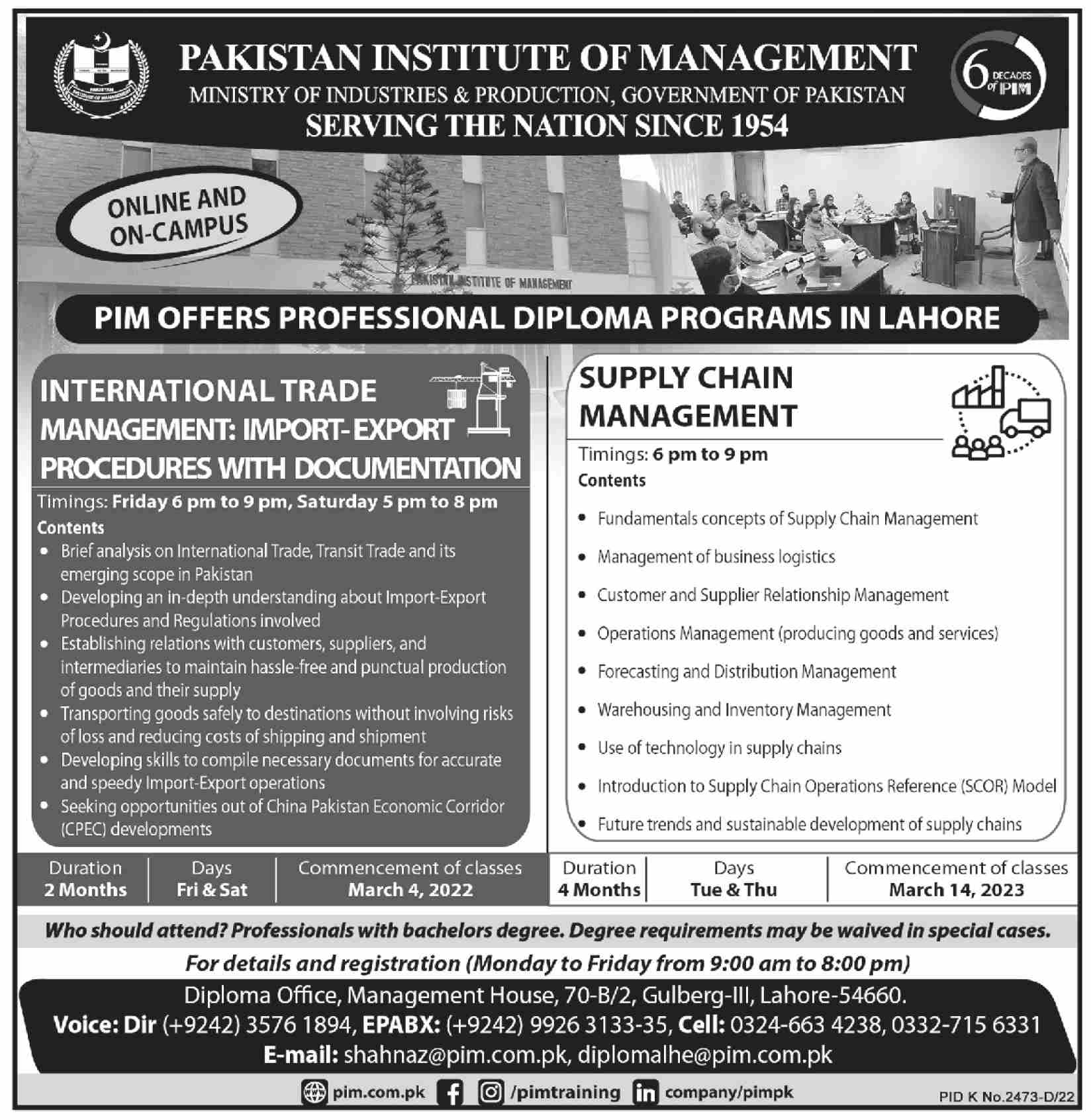 Pakistan Institute of Management admissions 2023 for International Trade Management, Supply Chain Management has been announced. Pakistan Institute of Management Lahore Punjab Pakistan welcomes students to apply for admissions in academic year 2023 in Management College. Eligible candidates for admissions in Diploma can apply as per Government institute criteria and before closing date 2 March 2023 after reading advertisement online. Read newspaper ad for exact details.