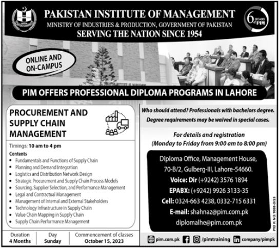 Pakistan Institute of Management has announced admissions 2023 for Diploma Program. Eligible students can apply for academic admissions 2023 in Pakistan Institute of Management Lahore Punjab Pakistan for Management Diploma. Eligible students for fulfilling criteria for admissions in Diploma can enroll as per Government admission policy 2023 till closing date 23 October 2023. Read newspaper ad for exact details.