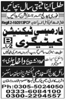 Royal College of Pharmacy Technician & Health Sciences Pharmacy Technician admissions 2024 has been started. Eligible students who qualify as per admission criteria in Royal College of Pharmacy Technician & Health Sciences Multan Punjab Pakistan can apply in Medical Diploma for academic year 2024. Eligible students for fulfilling criteria for admissions in Diploma can enroll as per Private admission policy 2024 till closing date 4 March 2024. Read newspaper ad for exact details.