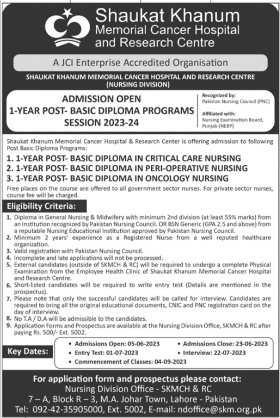 Shaukat Khanum Memorial Cancer Hospital & Research Centre Diploma Program admissions 2023 has been started. Shaukat Khanum Memorial Cancer Hospital & Research Centre Lahore Punjab Pakistan welcomes students to apply for admissions in academic year 2023 in Medical Diploma. Eligible candidates for admissions in Diploma can apply as per Private institute criteria and before closing date 23 June 2023 after reading advertisement online. Read newspaper ad for exact details.