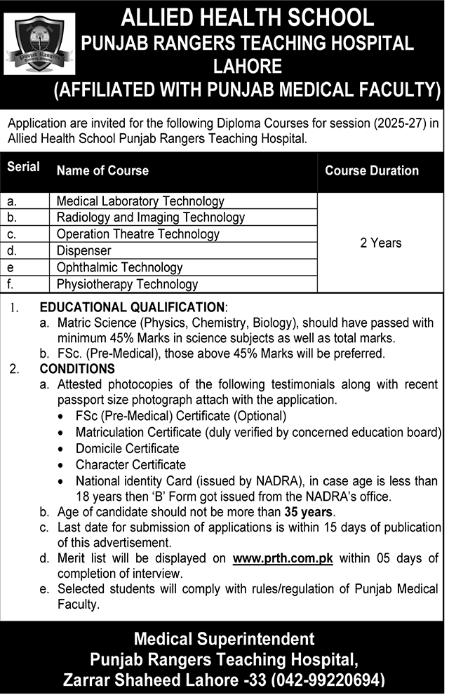 Alwatin Institute of Allied Health Sciences diploma admissions 2025 has been announced. Eligible students who qualify as per admission criteria in Alwatin Institute of Allied Health Sciences Lahore Punjab Pakistan can apply in Science College for academic year 2025. Students for admissions in & criteria can apply as per Government institute admission policy 2025 before closing date as per advertisement. Read newspaper ad for exact details.