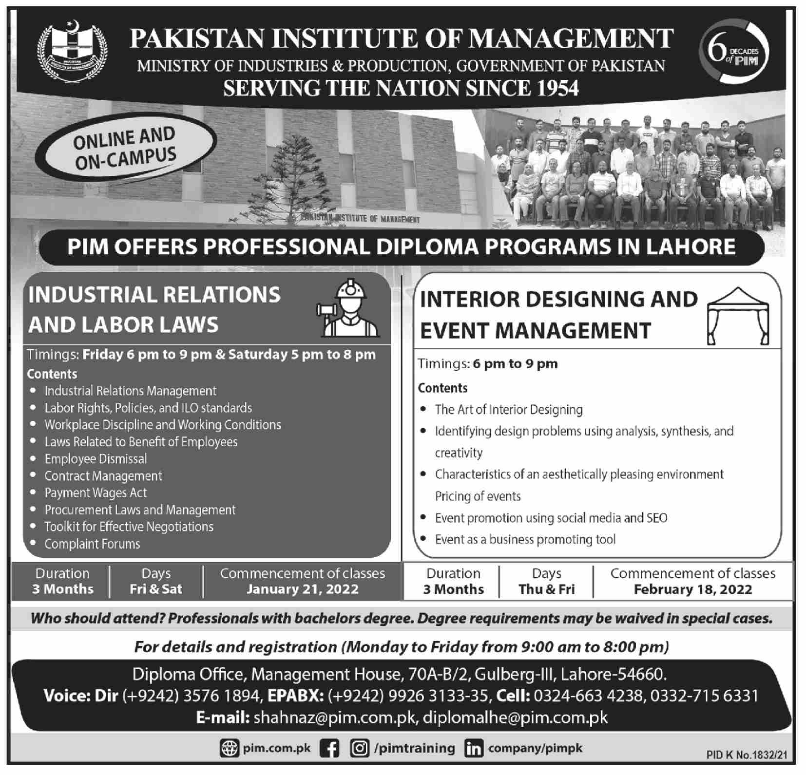 Pakistan Institute of Management is offering admissions in the Professional Diploma Programs of Industrial Relations and Labor Laws, Interior Designing and Event Management in Lahore. Read newspaper ad for exact details.