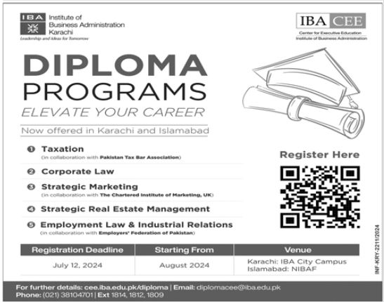 Institute of Business Administration IBA has announced admissions 2024 for Diploma Programs. Students who want to take admissions in Institute of Business Administration IBA Karachi Sindh Pakistan for academic year 2024 to continue education in Science Diploma can apply. Students for admissions in Diploma & criteria can apply as per Government institute admission policy 2024 before closing date July 12, 2024 as per advertisement. Read newspaper ad for exact details.