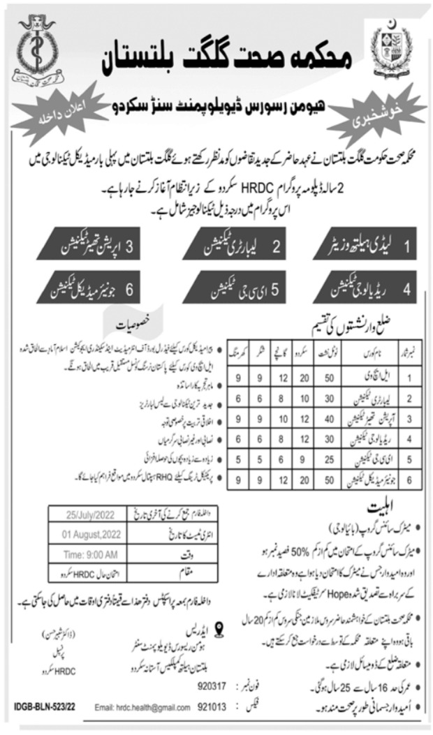 Health Department lady health visitors, laboratory technician, operation theater technician, medical technician, admissions 2022 has been started. Eligible students who qualify as per admission criteria in Health Department Gilgit Gilgit Baltistan Pakistan can apply in Management AIOU for academic year 2022. Students who want to enroll for academic session 2022 in Intermediate and Matric qualification and admission criteria for Government institute can apply till last date. Read newspaper ad for exact details.