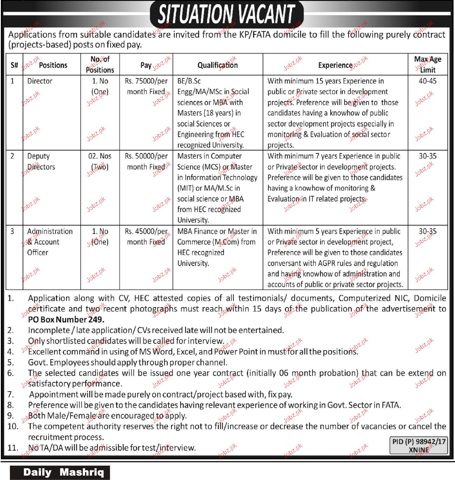 Apply as per details in job advertisement. Login to view further details of how to apply via https://www.jobz.pk online.
