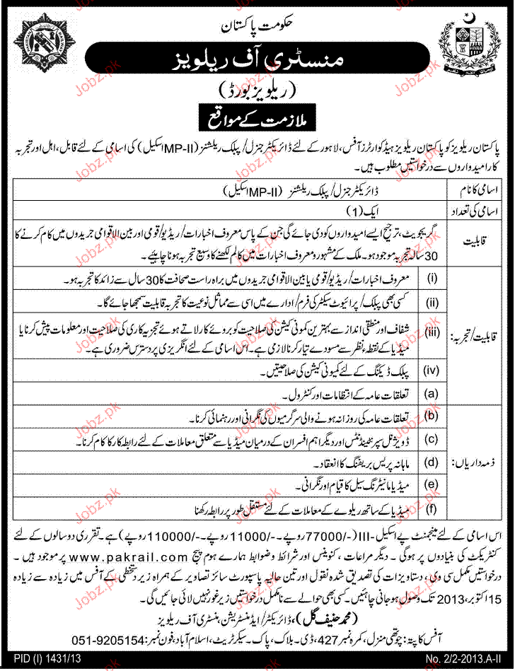 Apply as per details in job advertisement. Login to view further details of how to apply via https://www.jobz.pk online.