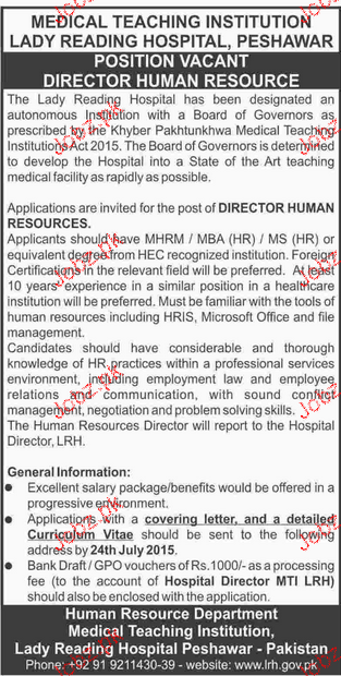 Director Human Resource Job In Lady Reading Hospital