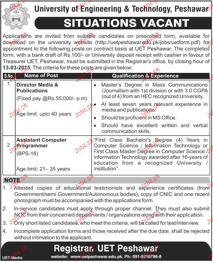 Apply as per details in job advertisement. Login to view further details of how to apply via https://www.jobz.pk online.