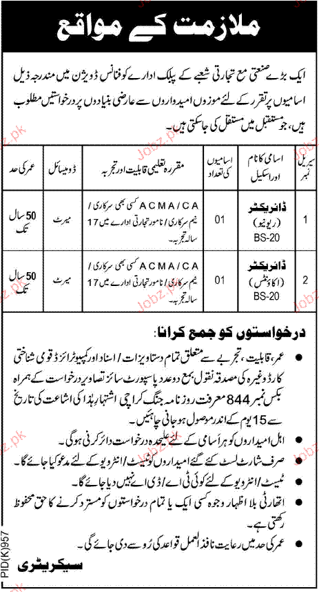 Apply as per details in job advertisement. Login to view further details of how to apply via https://www.jobz.pk online.