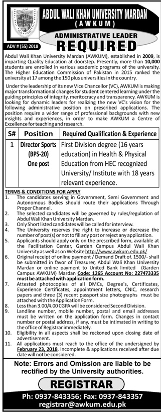 Director Sports Job In Abdul Wali Khan University AWKUM