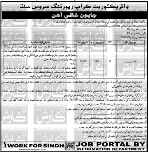 Government Organization Karachi, karachi Sindh Pakistan invites applications from eligible candidates for the post of crap reporter as per advertisement of December 11, 2025 published in daily Kawish Newspaper. Persons with Bachelor and Intermediate etc. education can apply.