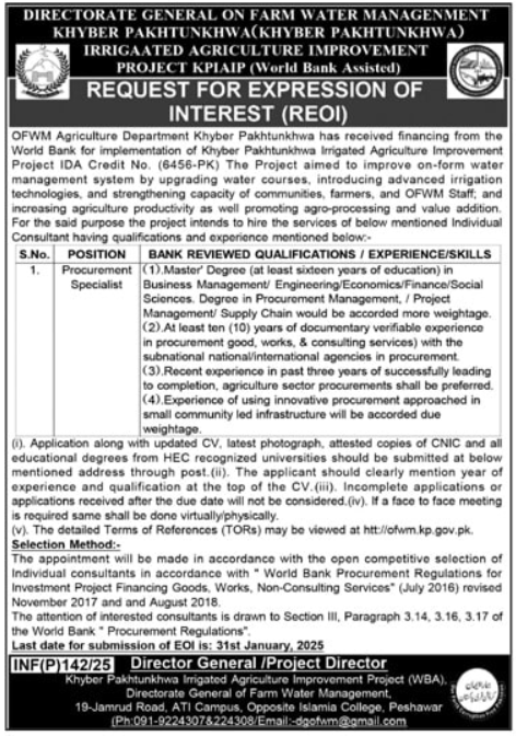 Directorate General of Farm Water Management jobs advertisement dated about 16 January 2025 in daily Mashriq Newspaper invites application for the vacant post of procurement specialist in Peshawar, peshawar Khyber Pakhtunkhwa KPK Pakistan. Candidates with Master, MS and Bachelor etc. educational background will be preferred.