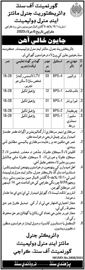 Directorate General Mines & Minerals Development Department Karachi, karachi Sindh Pakistan invites applications from eligible candidates for the post of driver, naib qasid, ltv driver, sanitary worker, sweeper, ferro printer and chowkidar as per advertisement of July 8, 2023 published in daily Jang Newspaper. Preferred Education is Middle and Primary etc.