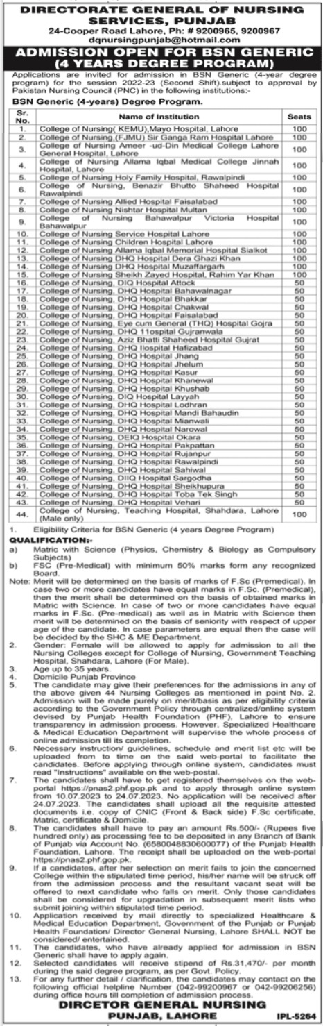 Directorate General of Nursing Services BS 4 Year Degree Program in Nursing, BSN Generic admissions 2023 has been started. Directorate General of Nursing Services Lahore Punjab Pakistan welcomes students to apply for admissions in academic year 2023 in Medical Medical College. Students who want to enroll for academic session 2023 in BSN qualification and admission criteria for Government institute can apply till last date 24 July 2023. Read newspaper ad for exact details.