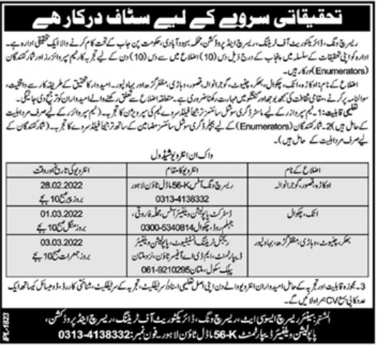Directorate General of Training & Research, Research Wing Directorate of Training Research & Production, Population Welfare Department invites applications for job positions advertised in daily Khabrain dated 19 February 2022 for following vacancies in Lahore, kasur, attock, muzaffargarh, okara, vehari, chiniot, chakwal, gujranwala and bahawalpur Punjab Pakistan.