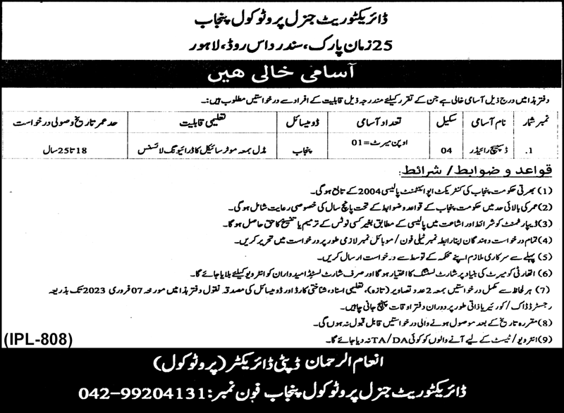 Directorate General Protocol invites applications for job positions advertised in daily Nawaiwaqt dated 21 January 2023 for following vacancies in Lahore, lahore Punjab Pakistan.
