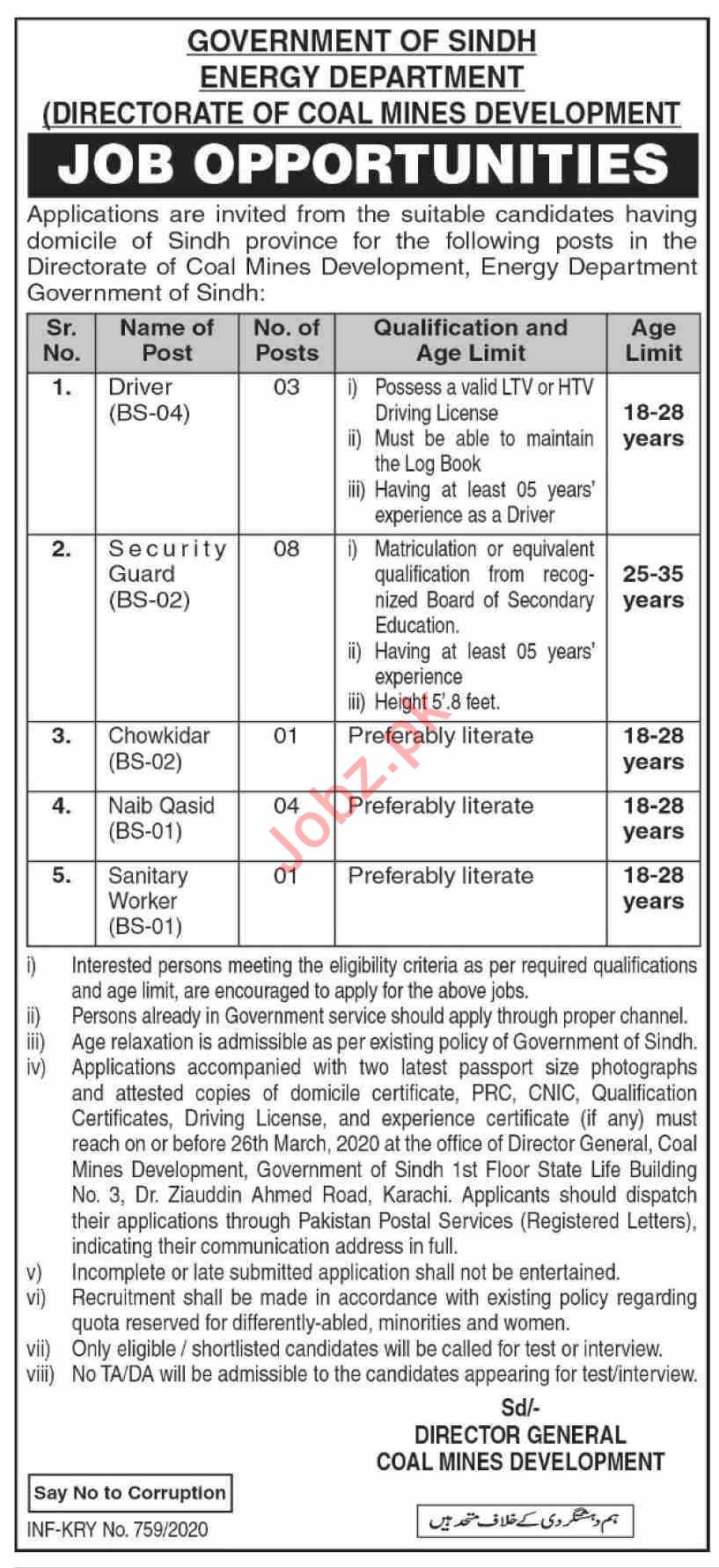 Directorate of Coal Mines Development Karachi Jobs 2020