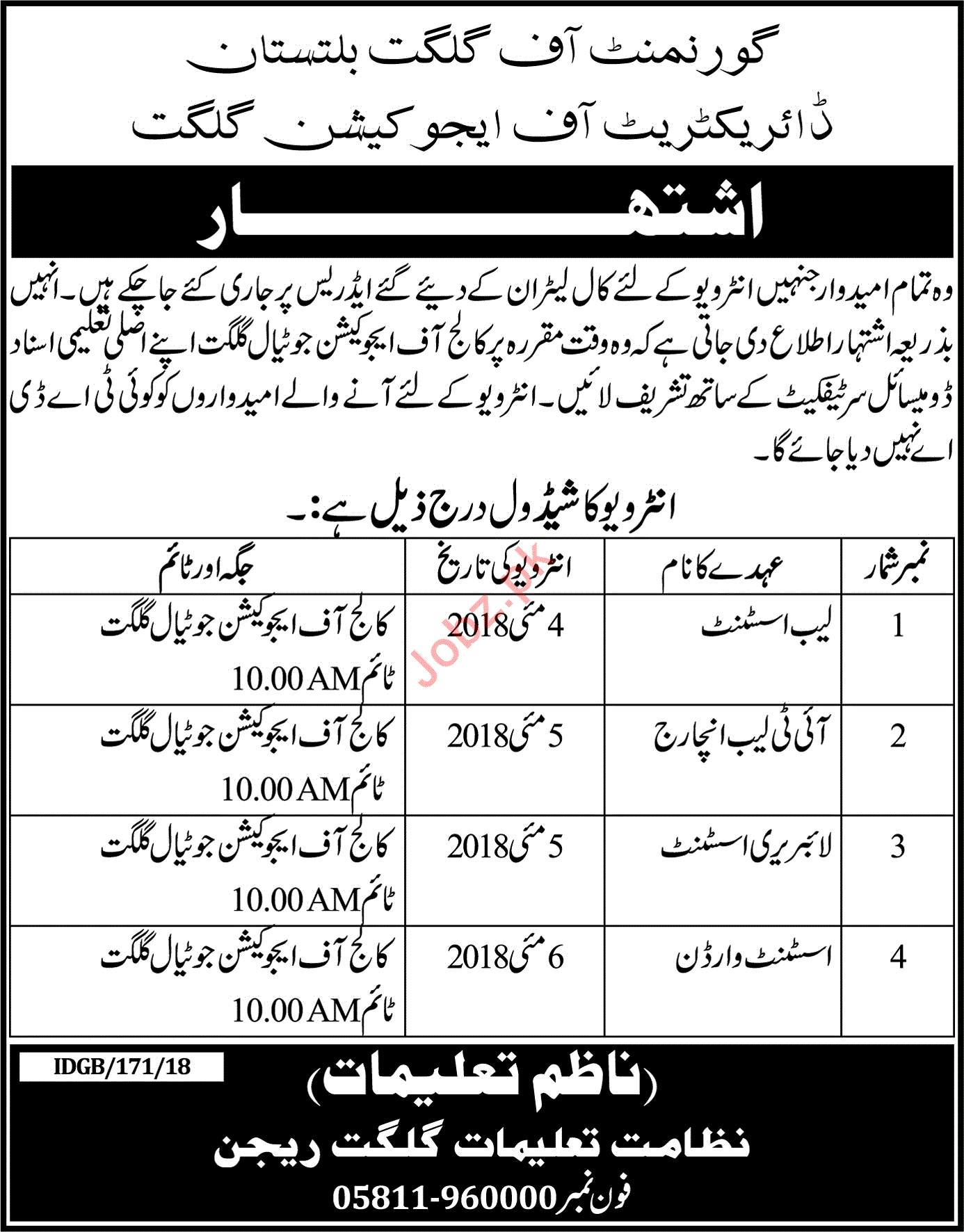 Directorate Of Education Gilgit Walk In Interviews 2018