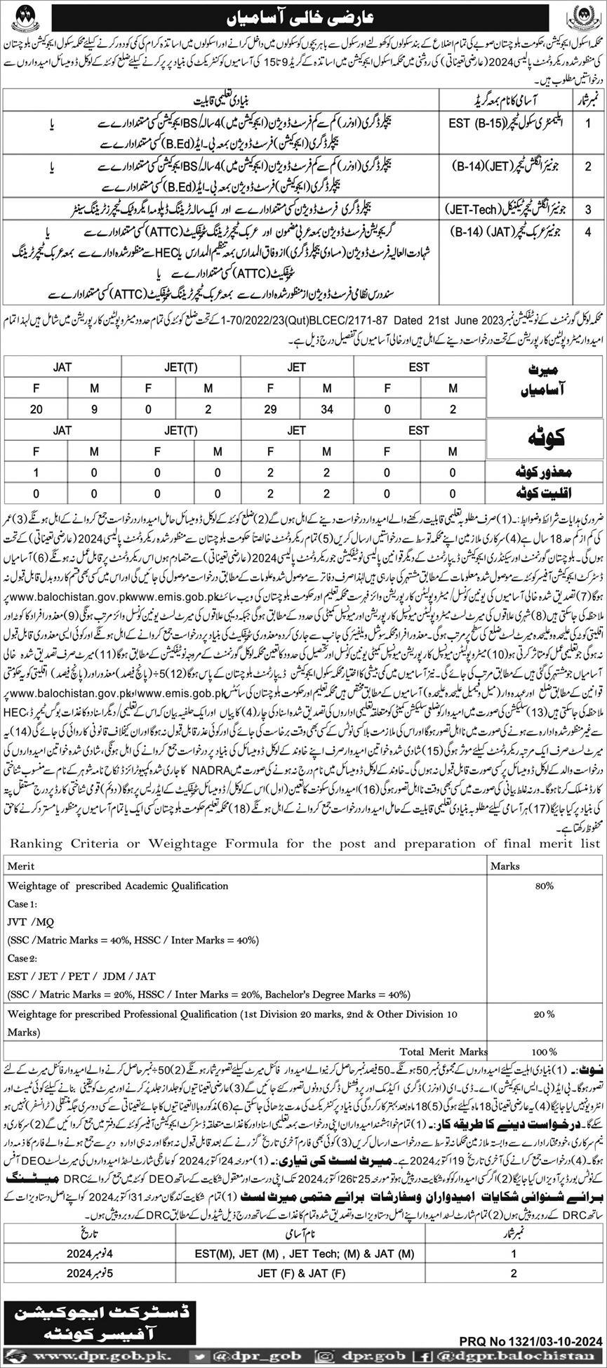 Vacant posts including elementary school teacher, english teacher technical, jet teacher, arabic teacher, english teacher, teacher and est teacher are announced in School Education Department Quetta, quetta Balochistan Pakistan as per 4 October 2024 advertisement in daily Express Newspaper. Candidates with B.ed, DAE, Bachelor and BA etc. educational background will be preferred.