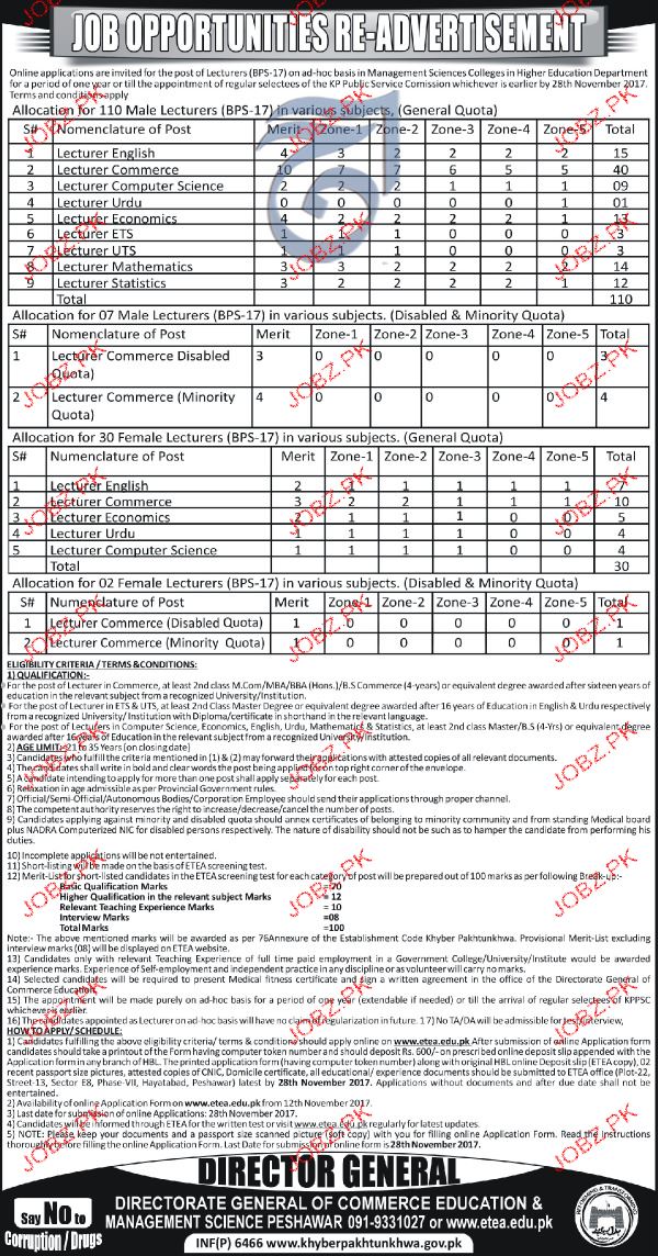Latest Directorate of General of Commerce Education and Management Sciences Teaching Posts Peshawar 2025