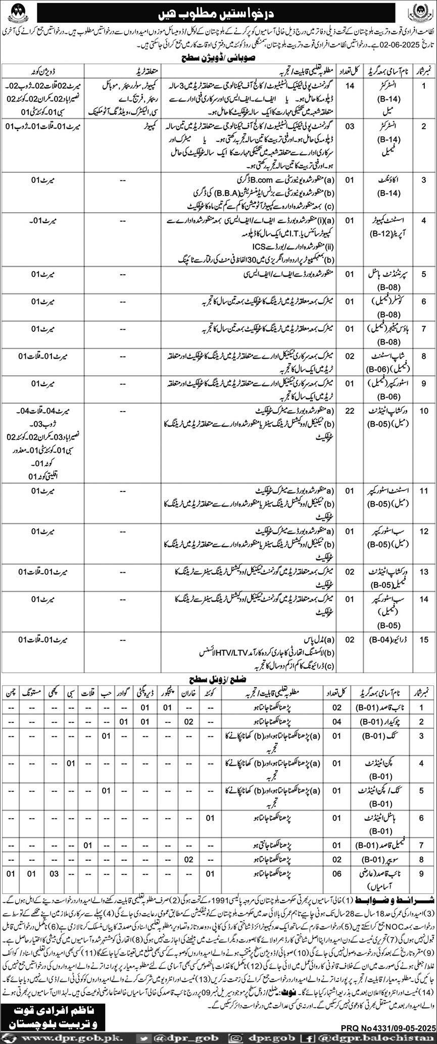 Labour & Human Resource Department jobs advertisement dated about 10 May 2025 in daily Express Newspaper invites application for the vacant post of female workshop attendant, kitchen attendant, female instructor, assistant computer operator, workshop attendant, female counselor, instructor, sweeper, htv driver, store keeper, chowkidar, naib qasid, driver, accountant, assistant store keeper, cook, shop assistant, counselor, ltv driver, hostel attendant, superintendent hostel, sub storekeeper female, sub store keeper, female qasid and house manager in Samungli Road Quetta, quetta Balochistan Pakistan. Preferred Education is Matric, Intermediate, Primary, B.com, DAE, BBA and Middle etc.