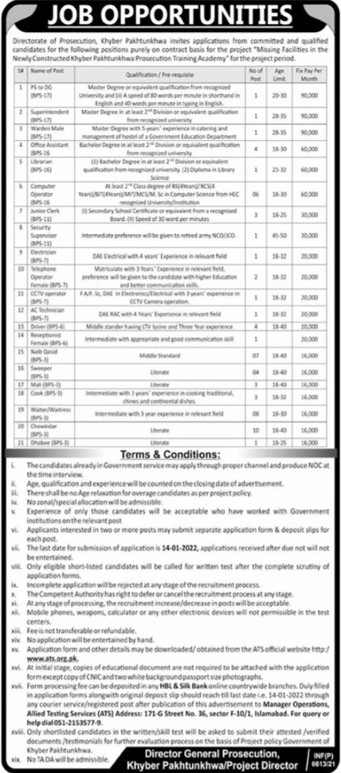 Directorate of Prosecution Khyber Pakhtunkhwa is looking for qualified expert and experienced professionals for the post of PS to DG, Superintendent, Warden Male, Office Assistant, Librarian, Computer Operator, Junior Clerk, Security Supervisor, Electrician, Telephone Operator, CCTV Operator, AC Technician, Driver, LTV Driver, Receptionist, Naib Qasid, Sweeper, Mali, Cook, Waiter, Waitress, Chowkidar, Dhobee in Peshawar through ATS website.