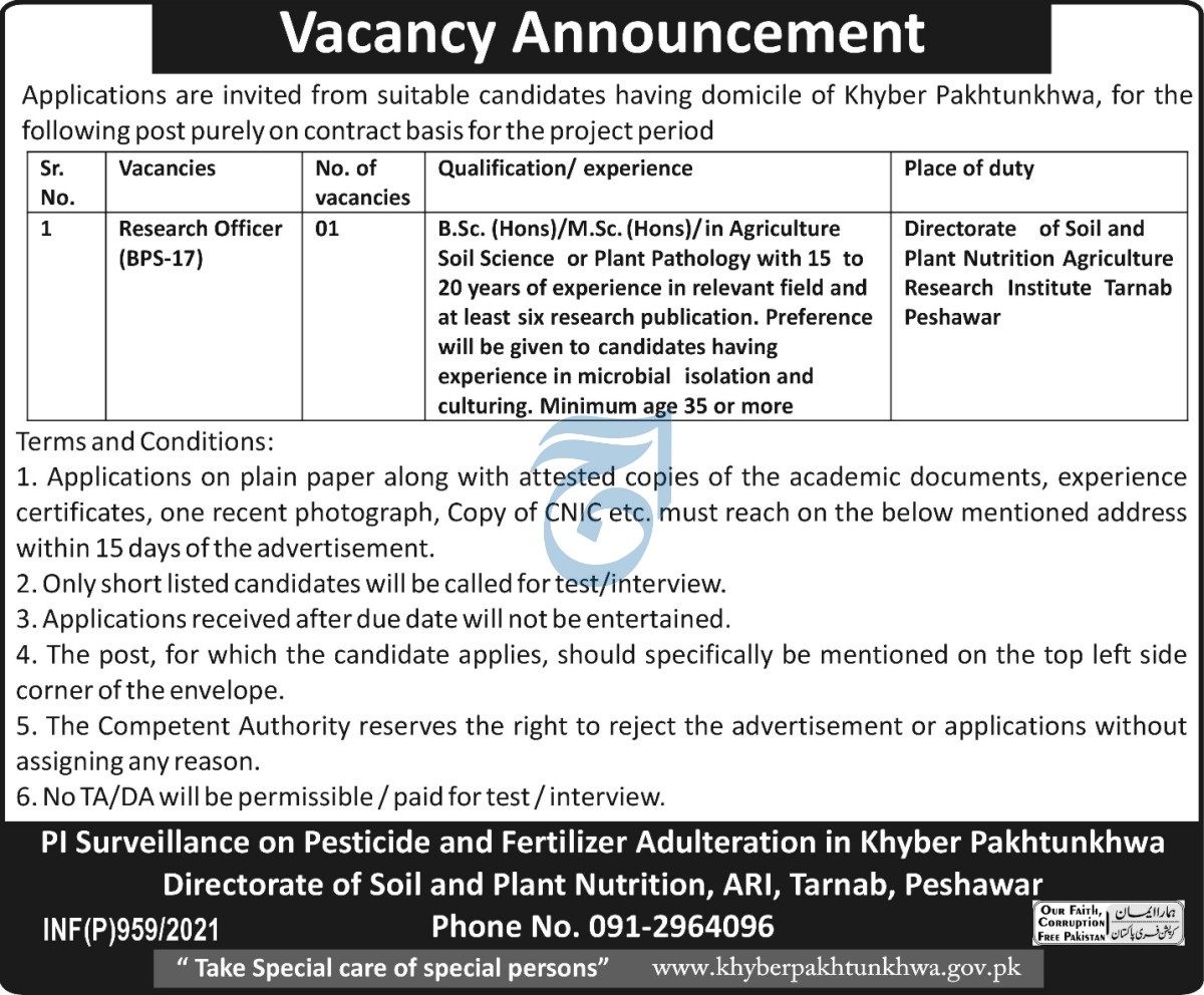 Latest Directorate of Institute of Soil Chemistry and Environmental Sciences Research Posts Peshawar 2025